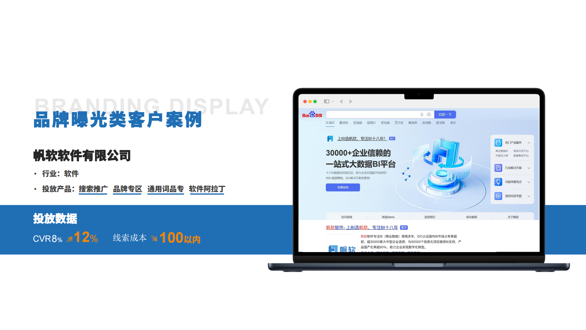 作为百度核心合作伙伴,我们累计服务超过10万家企业客户,投放体量超100亿元,覆盖700+个行业。团队由300余名资深营销专家、数据分析师、创意设计师和技术开发人员组成,致力于通过整合营销传播、精准数据分析和创新技术应用,帮助客户在竞争激烈的市场环境中脱颖而出。
